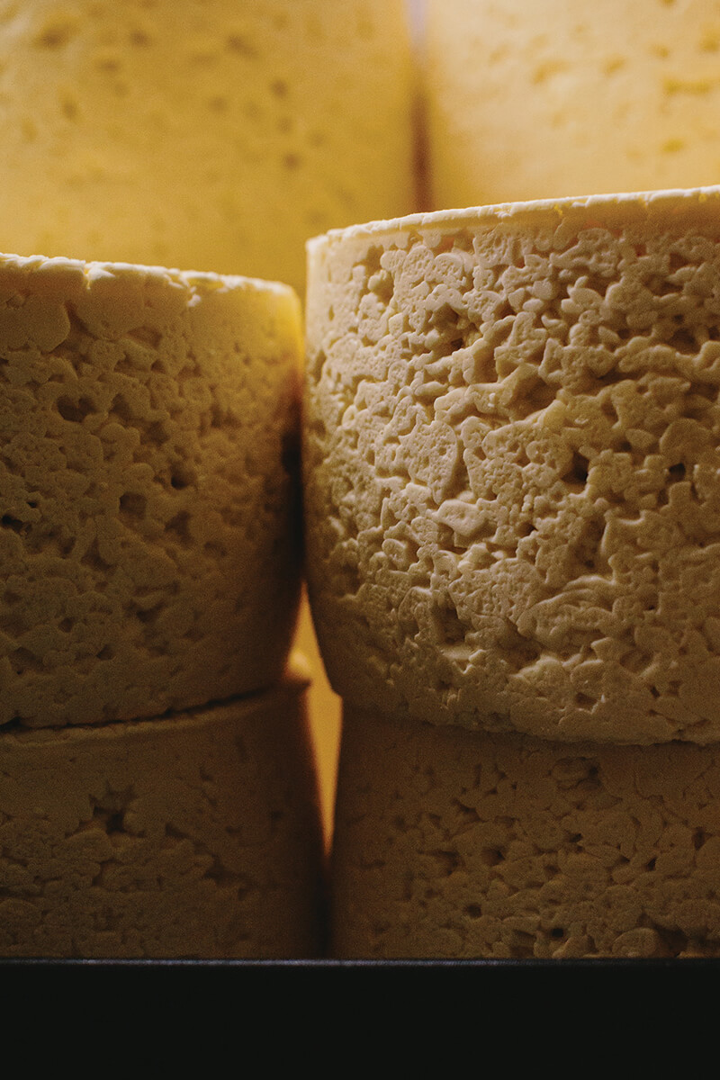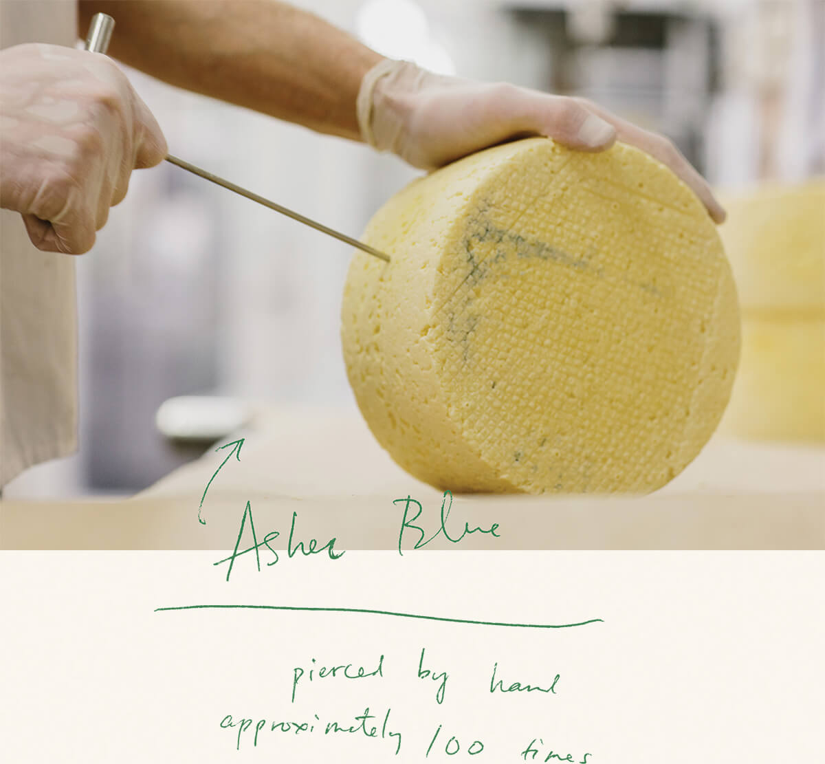 For instance, there’s Asher Blue, one of only three blue cheeses made in America that’s totally natural. “It has a natural rind and it’s hand-pierced approximately a hundred times—with virtually a knitting needle,” Gabe said. “That introduces oxygen into the interior of the wheel, which engages the culture, which is really aggressive, and just needs oxygen to exist. It formulates all those blue veinings and the big, robust flavors. Every single wheel is done by hand. There are pretty much no two wheels alike—each one you cut into is a snowflake.”